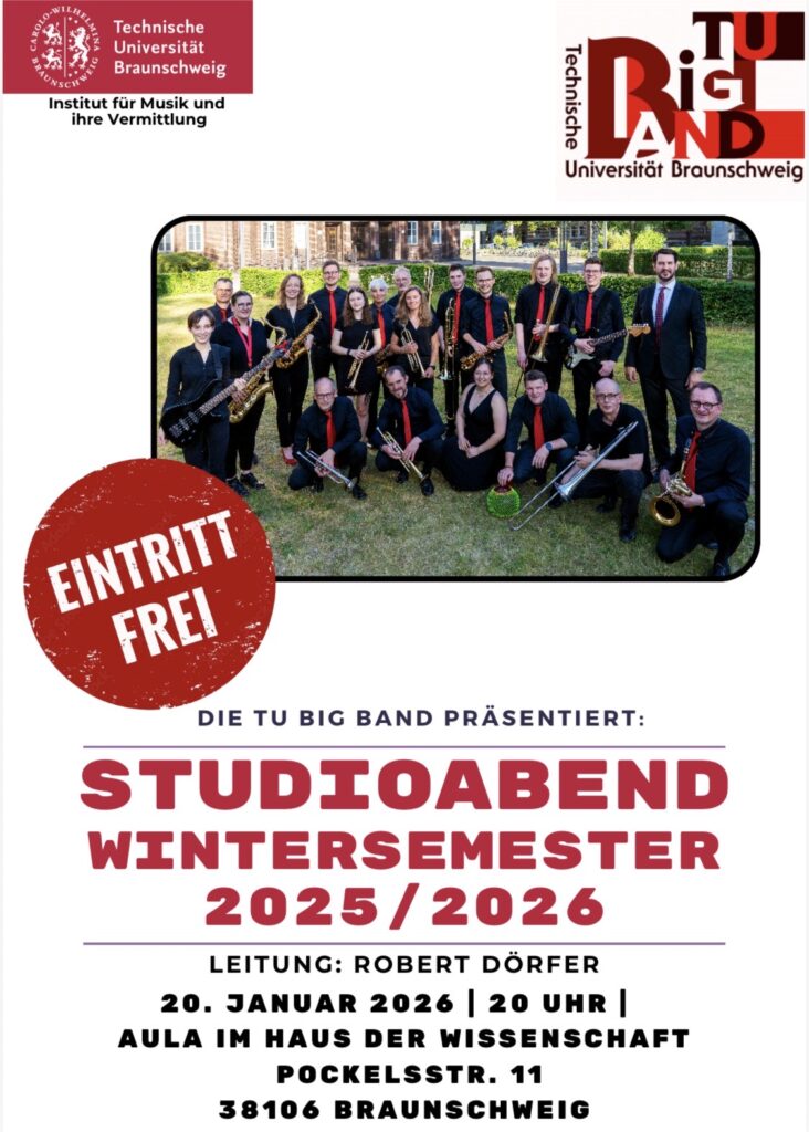 Am 20.01.2026 lädt die TU BigBand zum Wintersemesterkonzert 2025 / 2026 in die Aula des Hauses der Wissenschaft ein! Wir präsentieren ein neu einstudiertes Repertoire mit Klassikern von u. a. Peter Herbolzheimer, Bob Mintzer und Thad Jones und freuen uns, die Musik mit Ihnen und Euch zu teilen. Kommt gerne ab 19:30 Uhr vorbei, das Konzert beginnt um 20:00 Uhr. Adresse: Pockelsstraße 11 38106 Braunschweig, Eintritt frei.